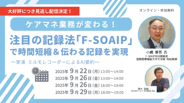 【続編開催直前!見逃し配信】ケアマネ業務が変わる!注目の記録法「F-SOAIP」で時間短縮&伝わる記録を実現