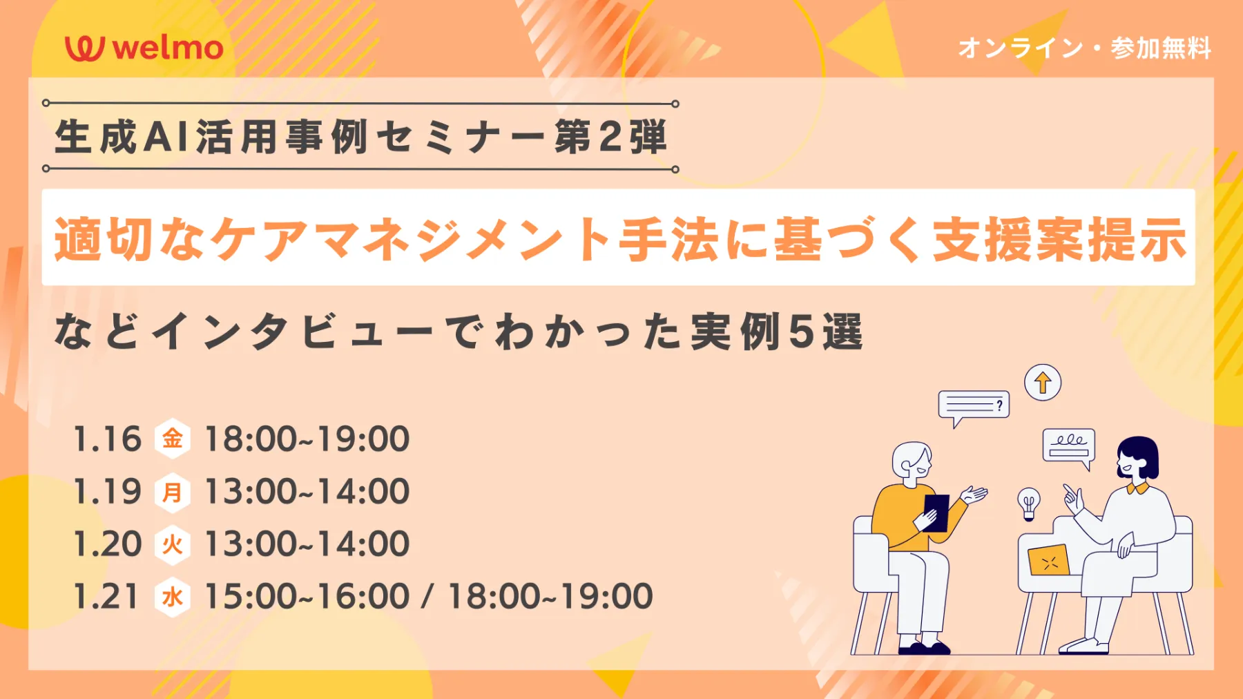 前回開催した生成AI活用事例セミナーでは、介護業界で生成AIを実際に活用している方へのインタビュー内容をもとにした事例紹介を行い、